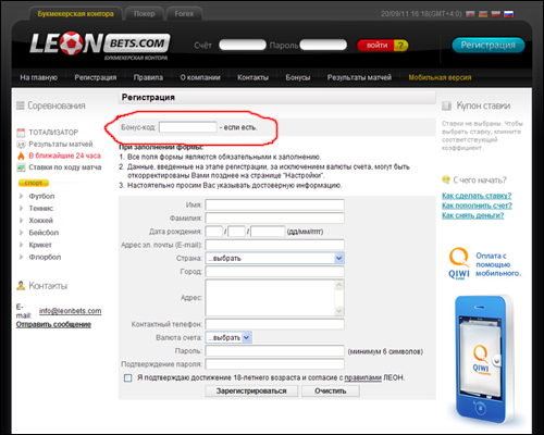 Все зависит от того, успели вы внести первый депозит или нет. Если уже внесли, то зарегистрируйтесь заново с нашим бонус кодом bkleon100, параллельно написав в техподдержку на адрес info@leonbets.com, объяснив ситуацию, чтобы они корректно закрыли ваш первый аккаунт. А деньги с него, естественно, перед этим выведите. Если же первый депозит еще не вносили, то еще проще - просто напишите в техподдержку на адрес info@leonbets.com и попросите перевести ваш аккаунт (укажите номер счета) под наш бонус код bkleon100, аргументируя тем, что просто забыли указать бонус код при регистрации.